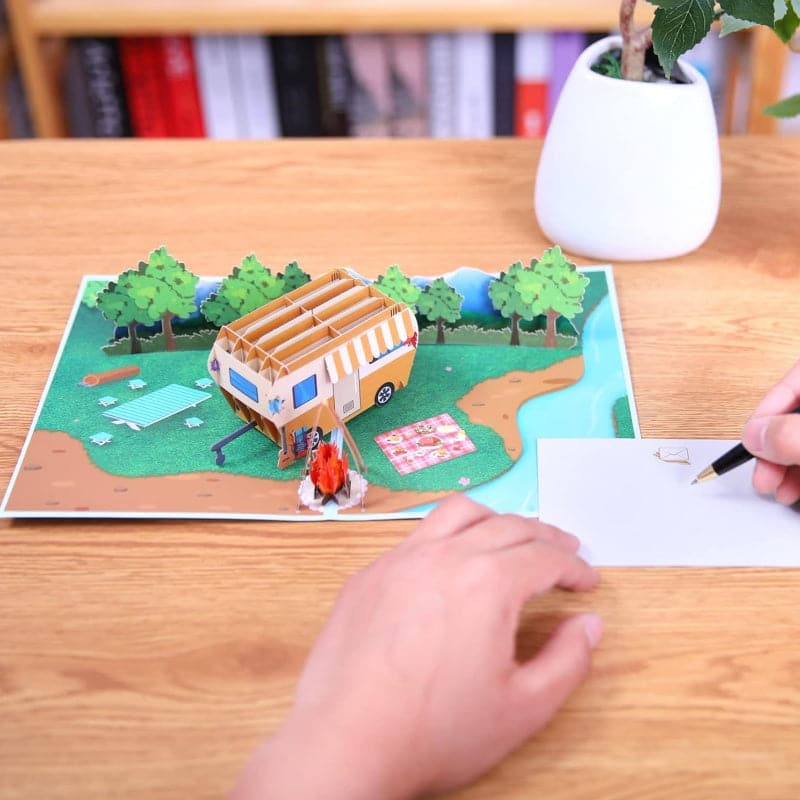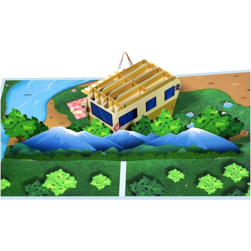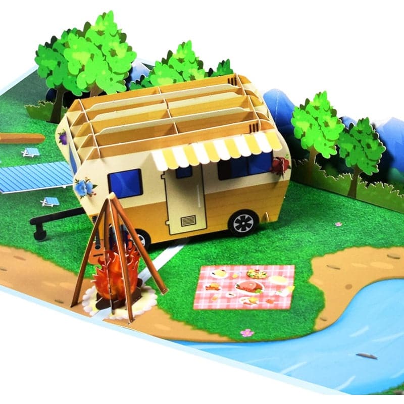 - Diseño Único: Esta hermosa tarjeta emergente con tema verde claro está especialmente diseñada para amantes del camping, amantes de la naturaleza y campistas entusiastas; representa un campamento tranquilo con una casa rodante, fogata, mesa de picnic, río y bosque... Esta tarjeta es el recuerdo 3D perfecto e interesante para enviar un mensaje personalizado, único y significativo para conectar con alguien especial.