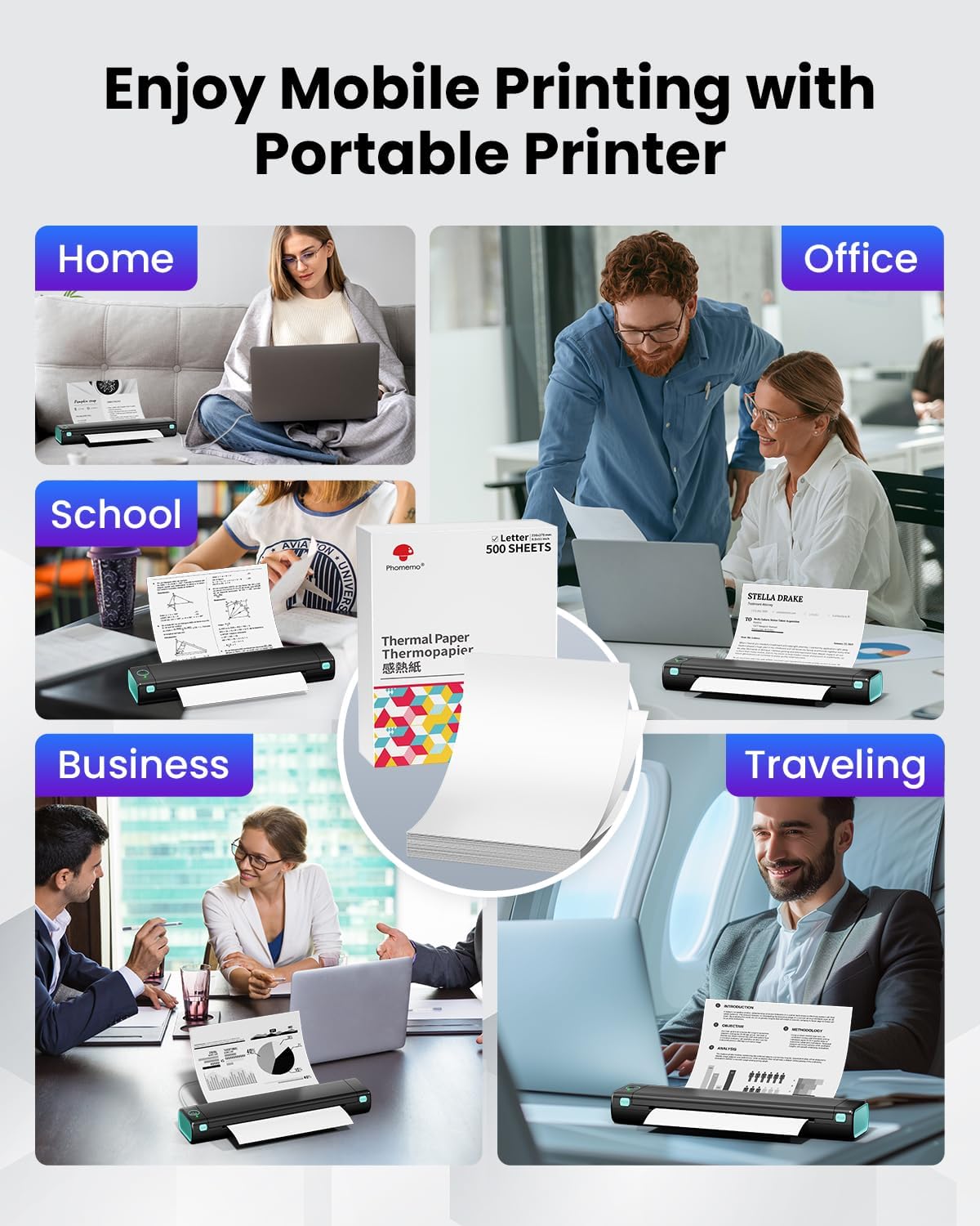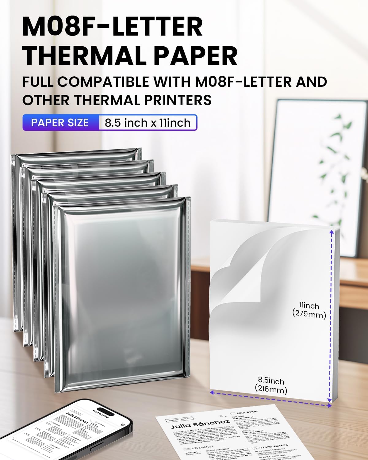 - Especificaciones - Papel térmico tamaño US Letter de 8.5" x 11", caja de 5 resmas (500 hojas), 100 hojas por paquete, para uso empresarial, de viaje, al aire libre y de oficina. Nota: El papel térmico Phomemo solo es adecuado para impresoras térmicas Letter, no es compatible con impresoras tradicionales de inyección de tinta o láser.
