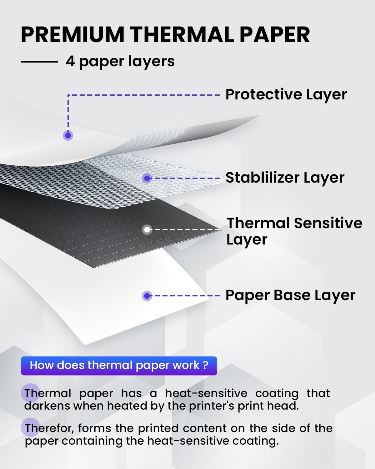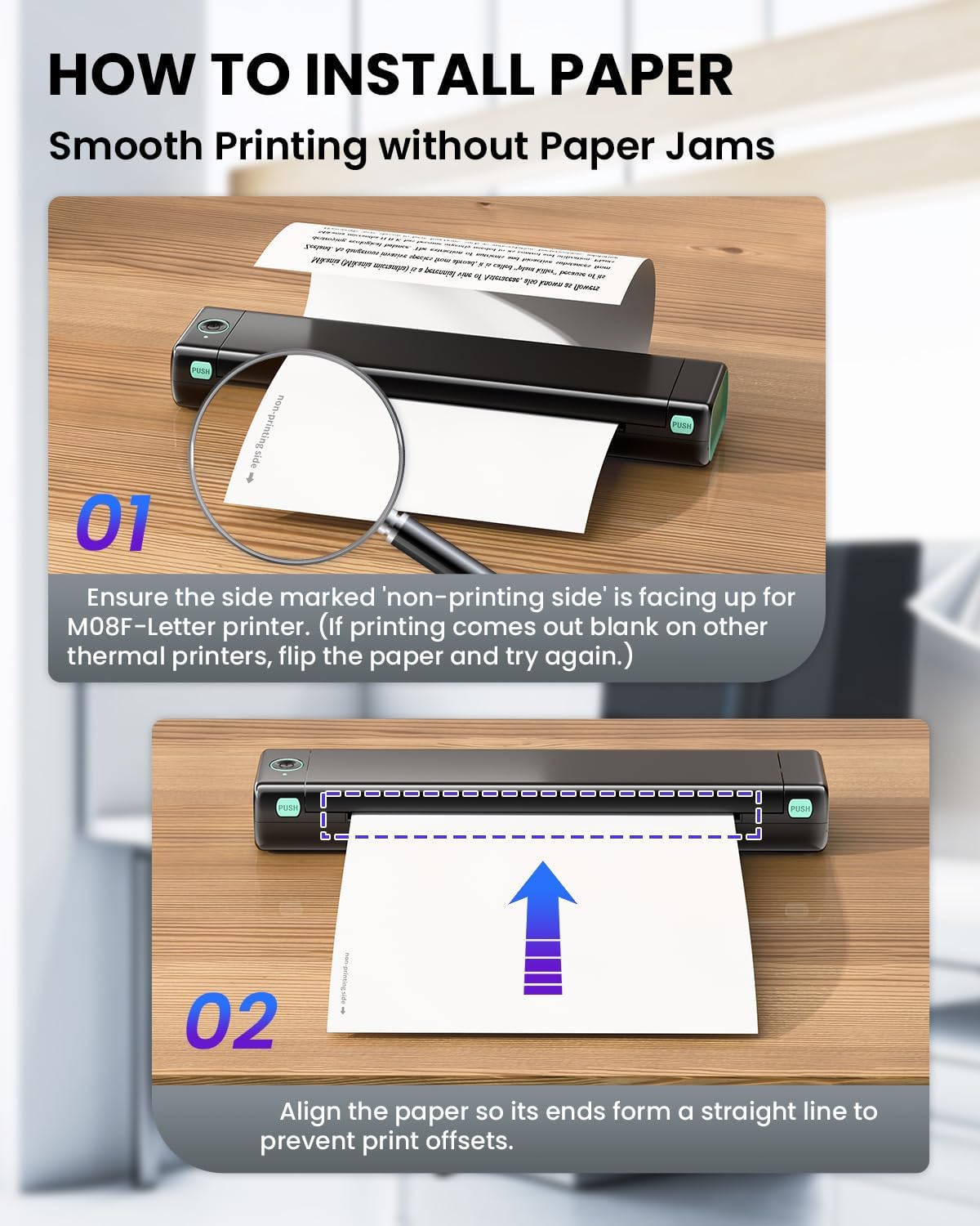 - Uso - Asegúrese de que ambos extremos del papel estén alineados en línea recta para evitar desajustes en la impresión. Tenga en cuenta que el lado del papel con las palabras "non-printing side" está en la parte posterior del papel para facilitar a los clientes colocar el lado correcto, de lo contrario, la impresión saldrá en blanco. Si la impresión sale en blanco, por favor voltee el papel e intente imprimir de nuevo. Por lo tanto, este papel térmico solo admite impresión por una cara.