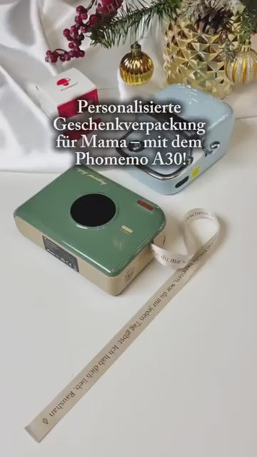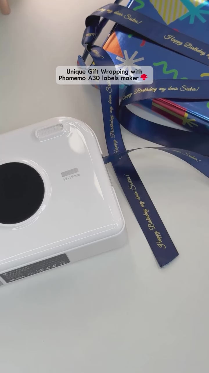 Custom gift ribbon printing using Phomemo A30 Bluetooth label maker — personalized Happy Birthday, Christmas, and love ribbons.