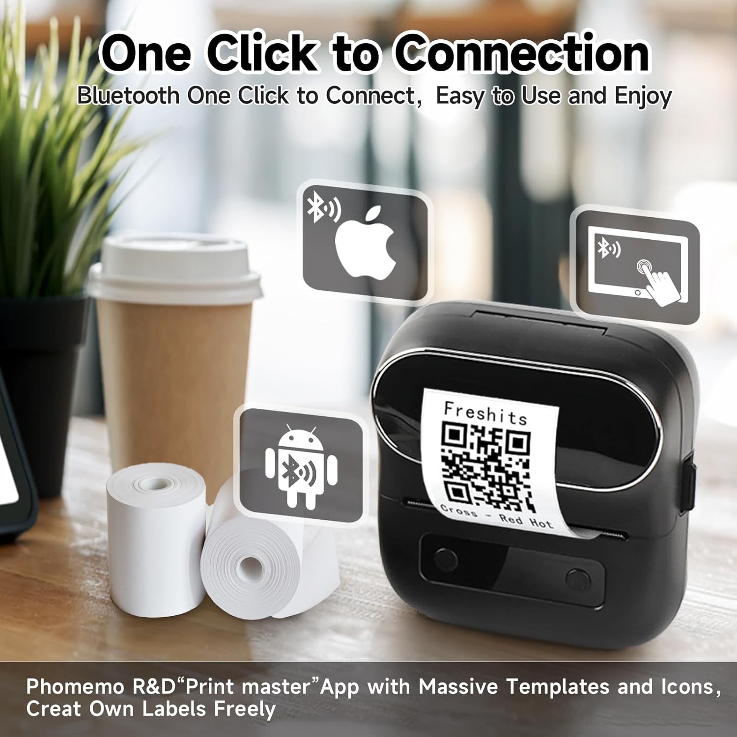 Blue 歯を磨いて、M220サーマルプリンターでラベル作成を始めましょう。PCをお使いの方は、Phomemoのウェブサイトからドライバーをダウンロードして、スムーズに印刷してください。 - 多様なアプリケーション: ラベル作成を簡素化するアイコンとテンプレートの膨大なライブラリを提供する「Print Master」アプリを使用して、テキスト、バーコード、QR コード、画像、住所などを印刷できます。