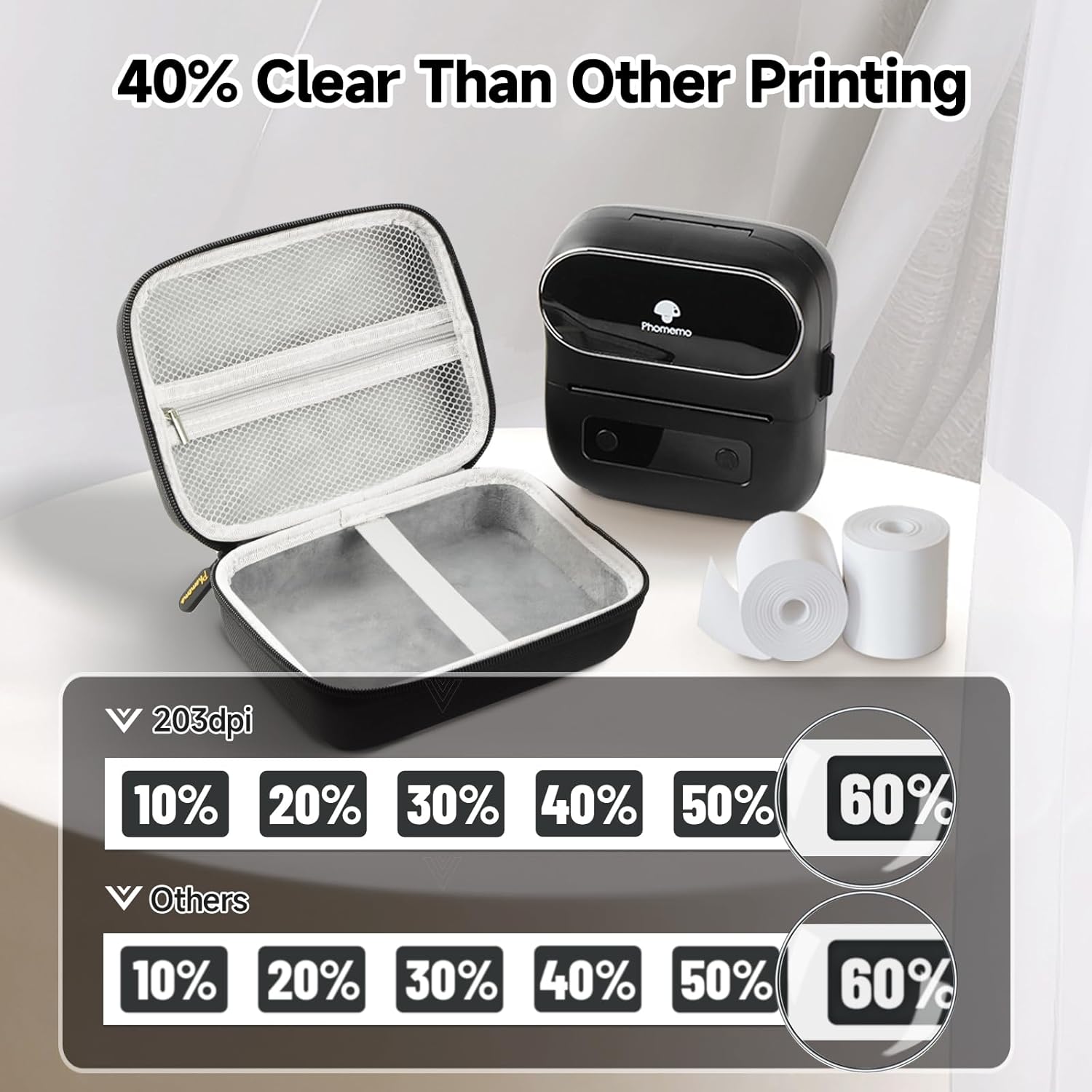 Blue 「Print Master」アプリを使用してスマートフォンやタブレットから簡単に印刷できる、歯の技術です。 - インクレスでコスト効率に優れています: インク、トナー、リボンを必要とせず、インクレス印刷を実現するアップグレードされたサーマルテクノロジーを採用しています。
