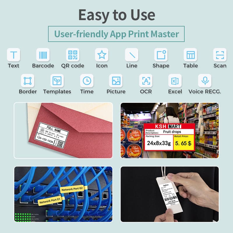 Compact and lightweight: The M110 printer weighs only 222.8g and measures 114*87*62mm so that you can print your labels anywhere, anytime.