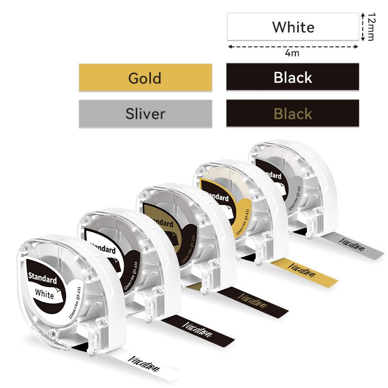 - Details: The sizes are 12mmx4m, there are five packs, and the color are Black on White, White on Black, Gold on Black ,Black on Gold, and Black on Silver.